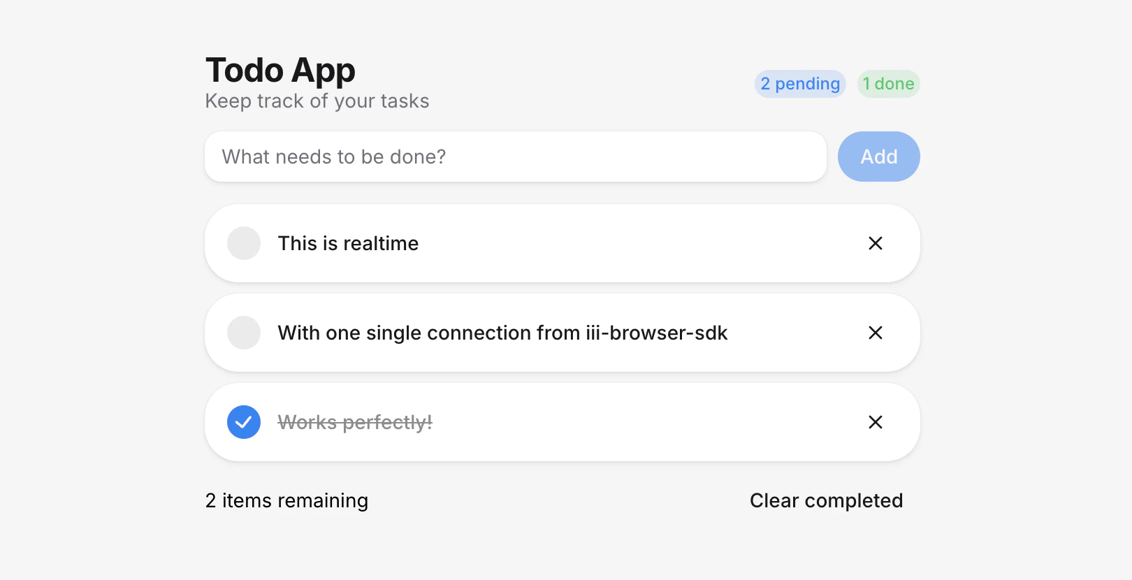 addTodo, toggleTodo, deleteTodo) call iii.trigger with the corresponding function ID. The response arrives over the same connection, and the stream trigger delivers the update to all connected clients.